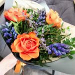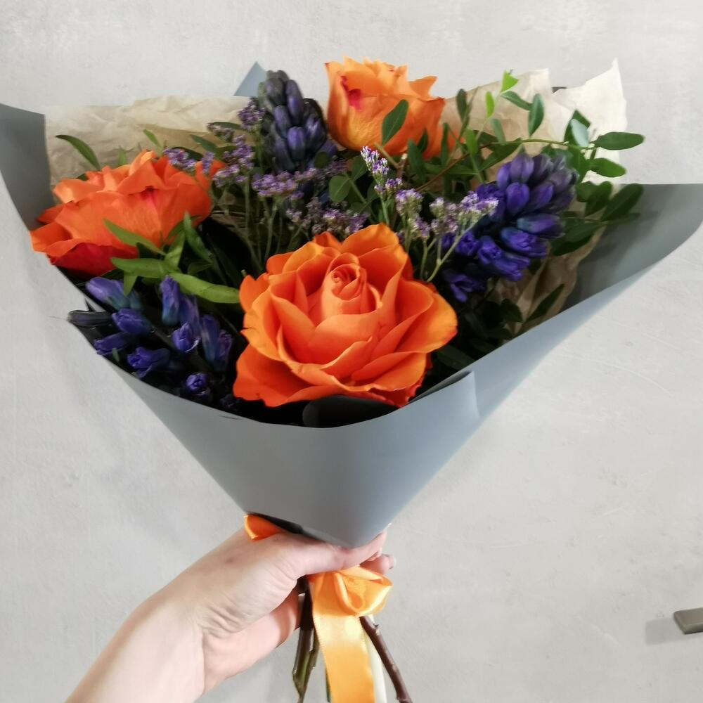 Лимониум – 1 шт.Лента атласная – 1 шт.Фисташка – 10 шт.Упаковка дизайнерская – 1 шт.Роза оранжевая – 3 шт.Гиацинт синий – 3 шт.