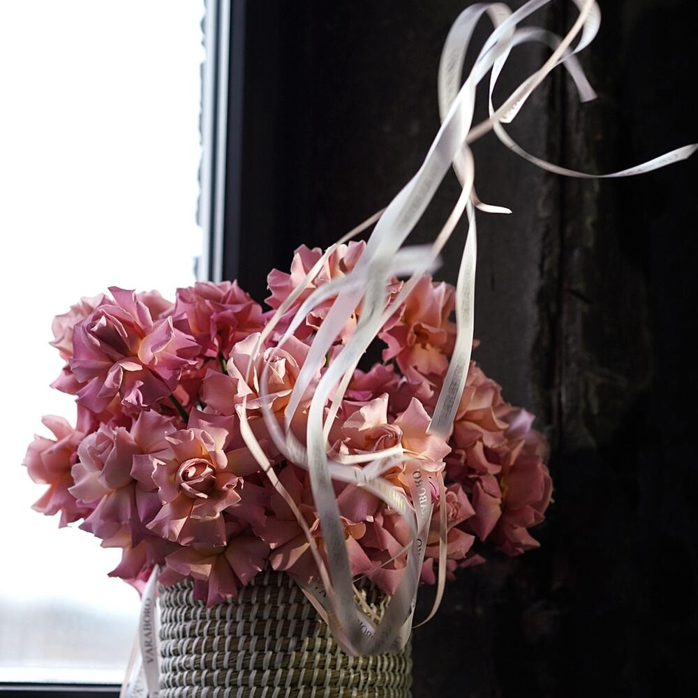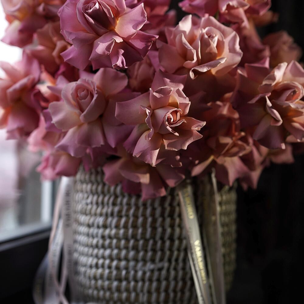 роза хермоса(5) – 35 шт.кашпо из джута ручной работы – 1 шт.Оазис флористический – 3 шт.Лента атласная – 2 шт.Лента брендированная – 2 шт.