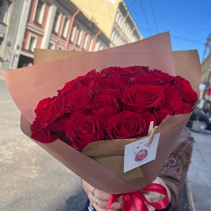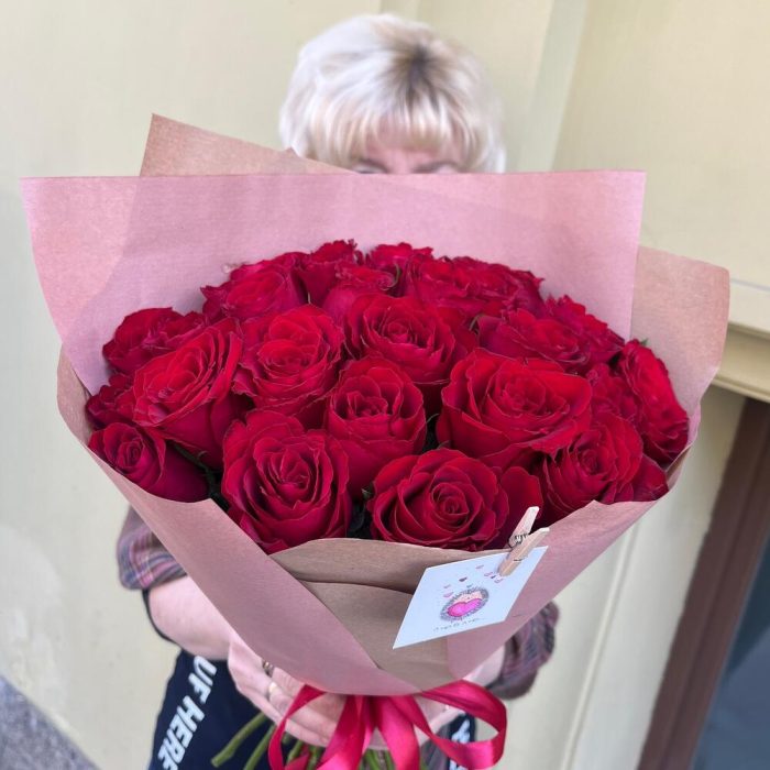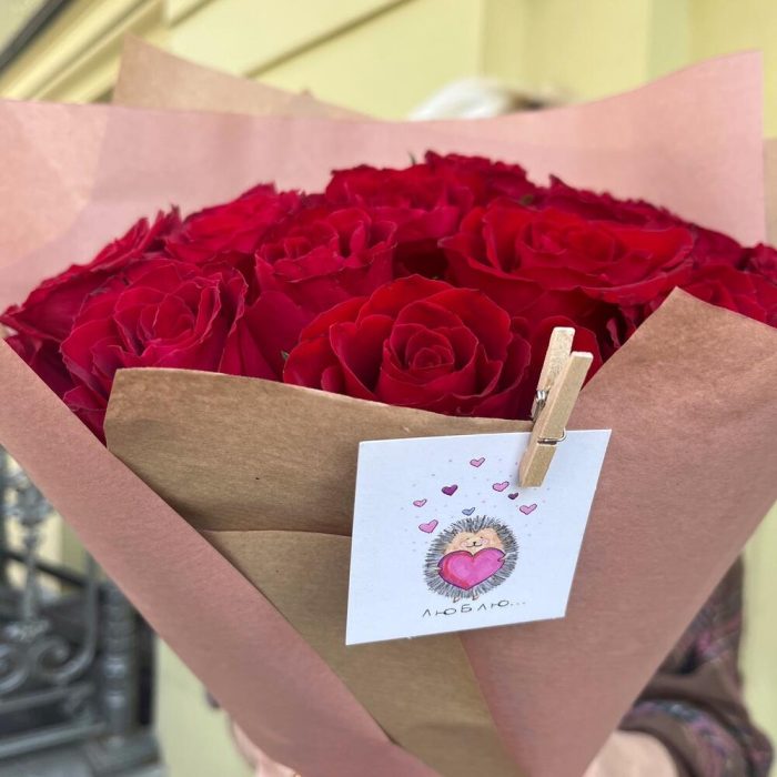 ЛЮБЛЮ 25 красных стойких роз в крафте