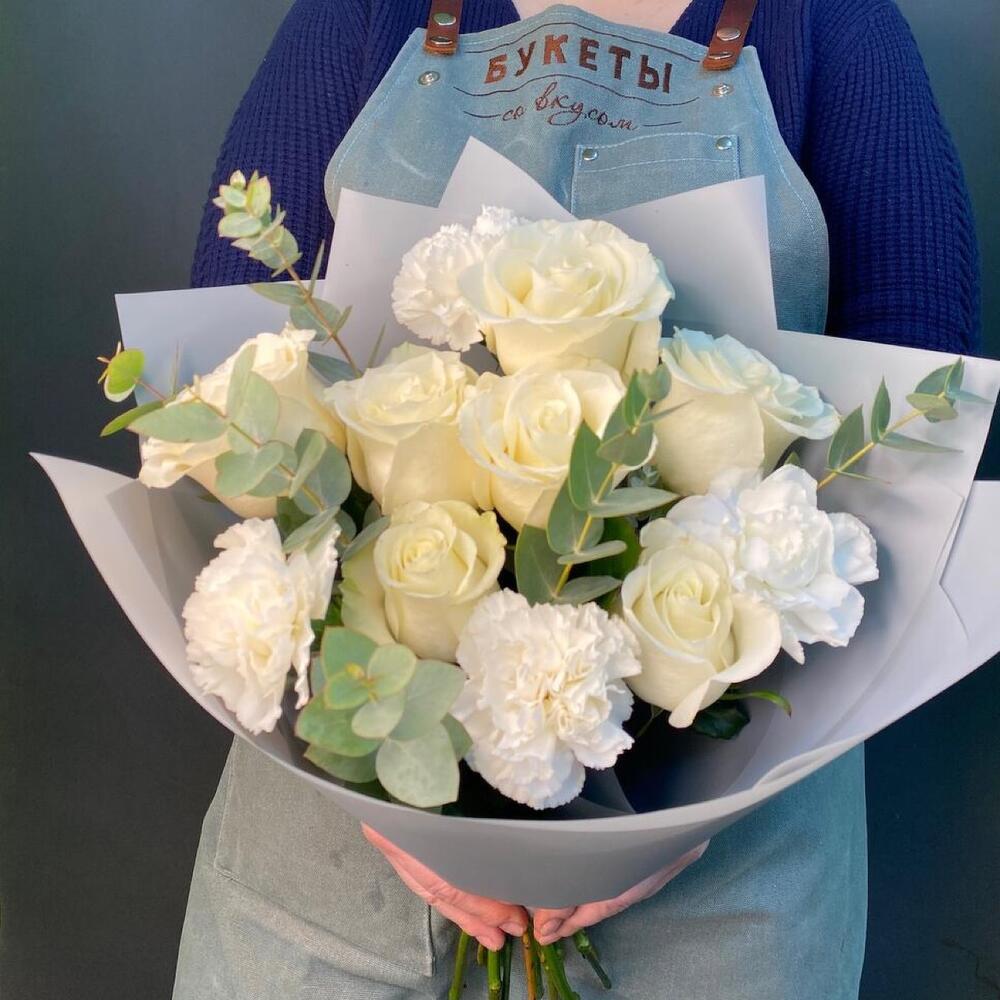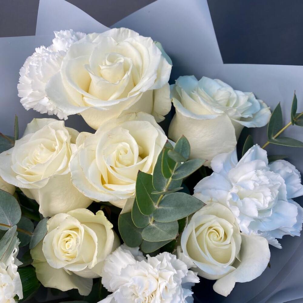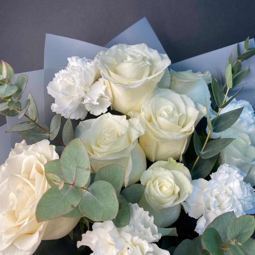 роза мондиаль белая – 7 шт.диантус белый сортовой – 4 шт.эвкалипт ценария большая ветка – 1 шт.Упаковка дизайнерская – 3 шт.