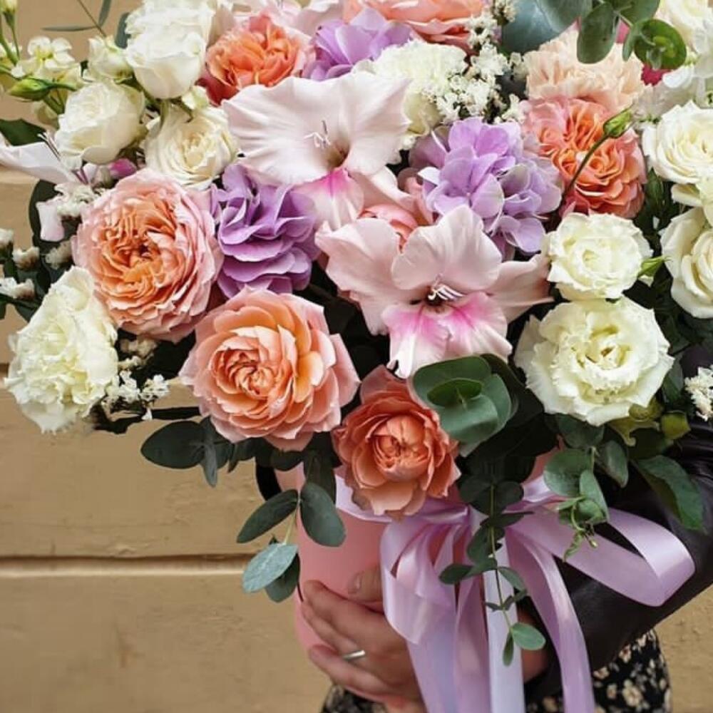 Коробка шляпная – 1 шт.Оазис флористический – 1 шт.Лента атласная – 2 шт.Калька упаковка – 1 шт.Гортензия – 1 шт.Гладиолус – 2 шт.роза пионовидная джульетта кустовая – 4 шт.Маттиола – 3 шт.эустома белая – 3 шт.Статица – 3 шт.Эвкалипт – 7 шт.Роза кустовая белая – 4 шт.
