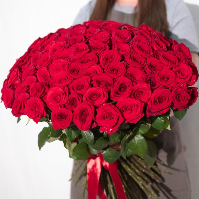 Лента атласная – 2 шт.Красная роза – 101 шт.инструкция по уходу за цветами – 1 шт.любовь флориста (бесплатно) – 1 шт.подкормка для цветов chryzal – 1 шт.
